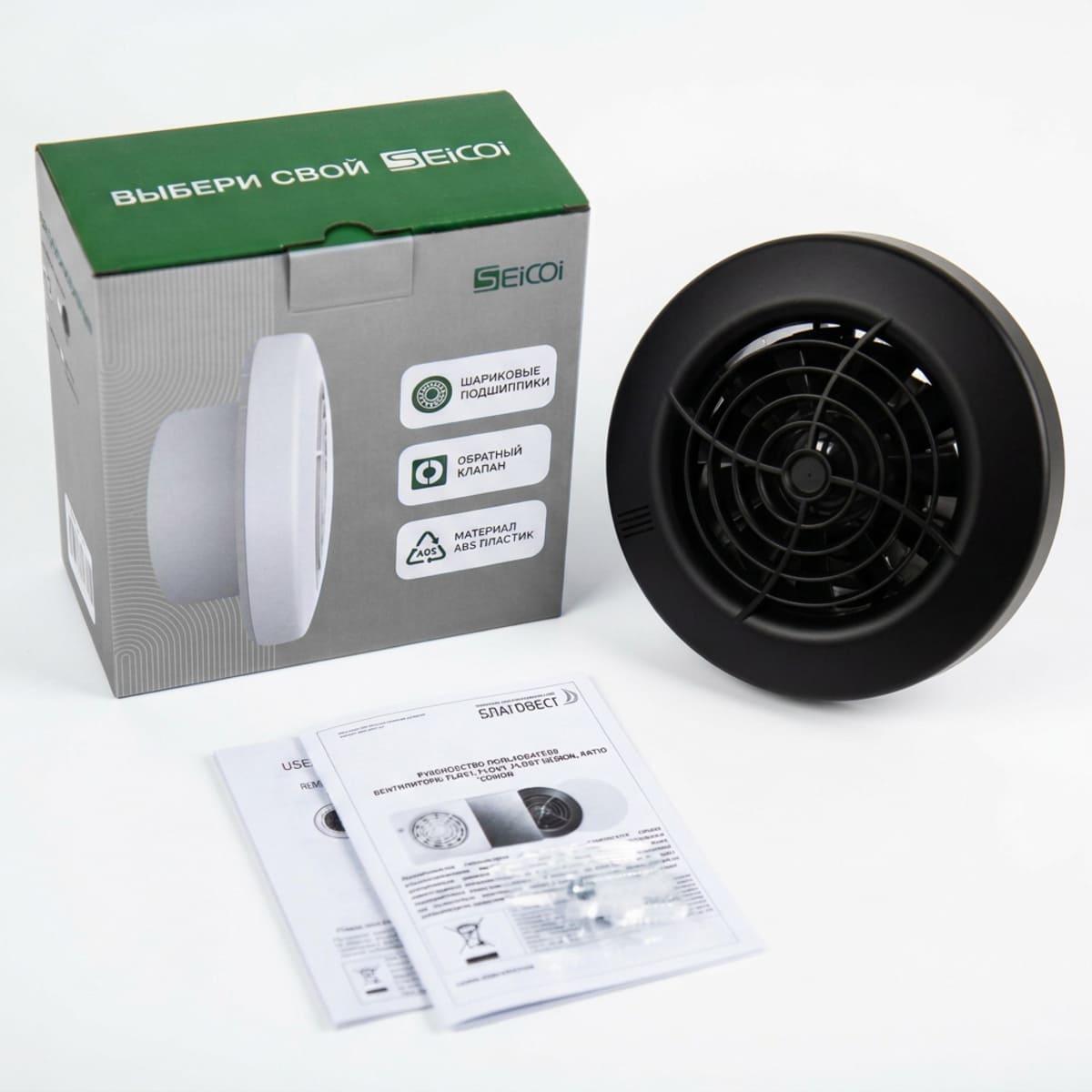 • Качественный материал. Вентилятор изготовлен из высококачественного ABS пластика, который устойчив к воздействию UV излучений, влаги и пыли.